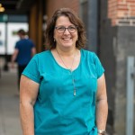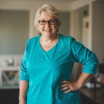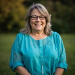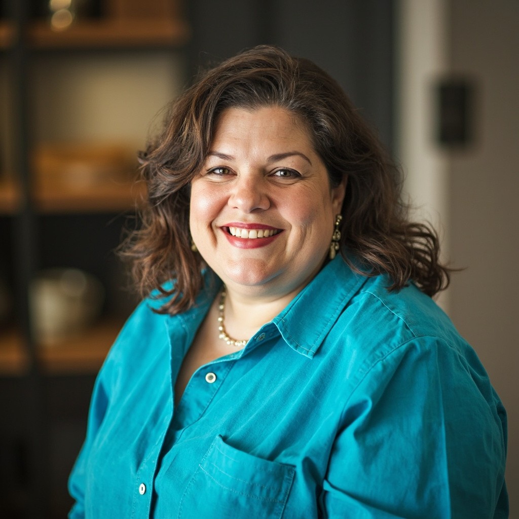Smiling Middle-Aged Female in Turquoise Clothes Standing