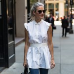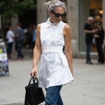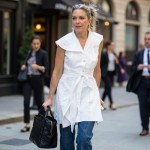 use this garment from Amazon:Norma Kamali Women's Super Sleeveless Button front Neck Shirt Flared Mini Dress in white poplin with self sash and short wide sleeves to cover. Dress ends at 6" above knee. Hem is even. Show it on a 40-year-old woman with with a messy pony tail. Her hair is grey. she is wearing this dress with denim fitted flared jeans and high heel black sandals. she is in a city setting and is carrying an Italian black leather woven bag with hands. show full figure.
