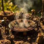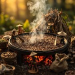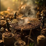 "Miniature figures in straw hats carefully roast freshly harvested coffee beans on a massive round tray over an open fire. Some tiny workers stand on wooden stools, using oversized wooden rakes to evenly stir the beans, ensuring they roast to perfection. Others tend to the fire, adjusting logs and fanning the flames to maintain the ideal temperature. The air is filled with the rich aroma of roasting coffee, as wisps of smoke rise into the warm, golden light of the setting sun. Surrounding the roasting area, woven baskets overflow with freshly picked beans, while small sacks of already roasted coffee are neatly stacked nearby. The atmosphere is rustic and immersive, capturing the timeless artistry of coffee-making in this miniature, handcrafted world."