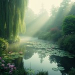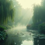 Morning Mist Over Lush Garden with Pond and Water Lilies