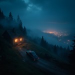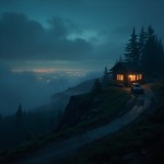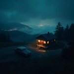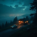 Solitary cabin on a misty mountain slope at night, overlooking a distant glowing city skyline, warm orange light glowing from the cabin windows and front door, a parked vintage car on a wet winding road, soft fog in the air, cinematic moody lighting, deep blue twilight sky, peaceful yet emotionally intense atmosphere, pine trees in the background, ultra-realistic, shot on ARRI Alexa with wide-angle lens, high dynamic range