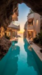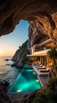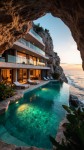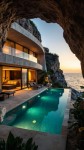 A luxurious modern villa with smooth stone walls and floor-to-ceiling glass panels is nestled into a dramatic seaside cliff cave, featuring an infinity-edge swimming pool blending into the turquoise ocean horizon under golden sunset light, surrounded by rugged rock formations with ambient lighting highlighting contemporary outdoor furniture and tropical plants, creating a harmonious fusion of natural grandeur and architectural sophistication.