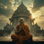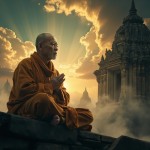 A serene ascetic monk seated cross-legged in front of an ancient stone temple at dawn, hands folded in prayer, gazing thoughtfully at dramatic cumulonimbus clouds overhead; soft golden light illuminating his saffron robes and the temple façade, mist rising from the temple steps, ultra-detailed, cinematic atmosphere.