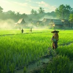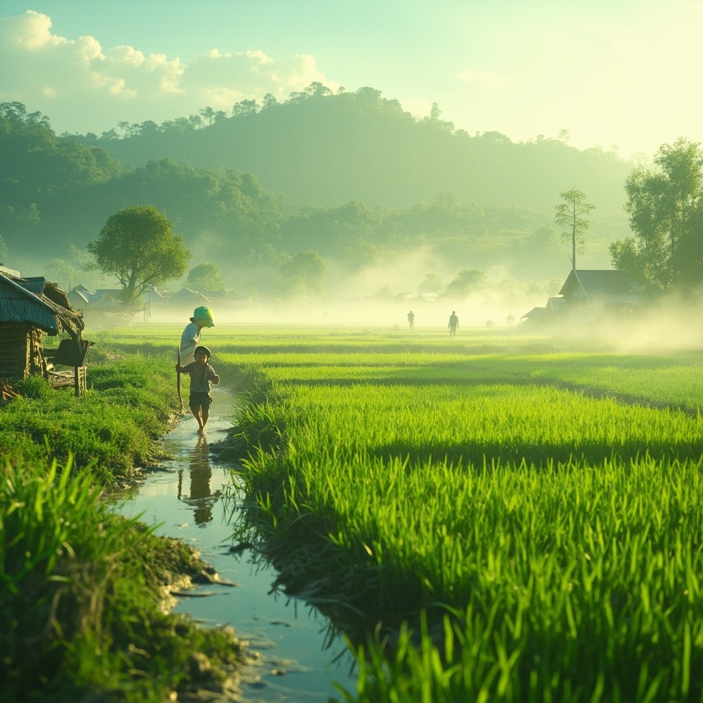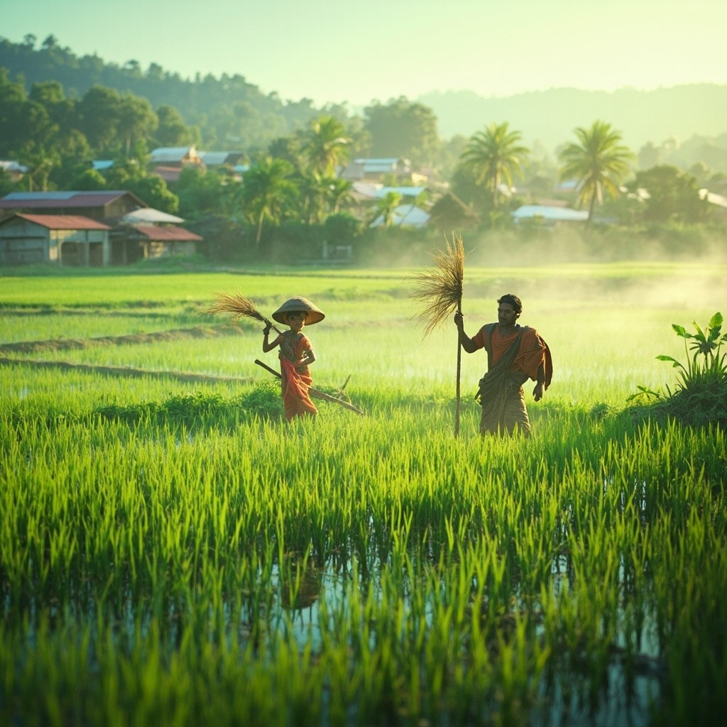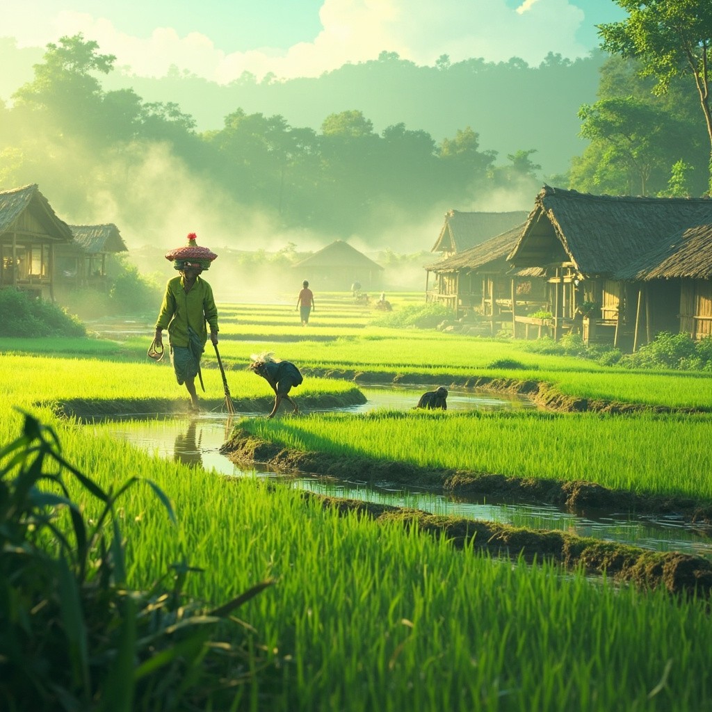 Early Morning in Shimultala: 3D Cartoon of Vibrant Indian Village with Farmers and Rice Fields