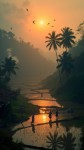 A peaceful village morning at sunrise, the camera facing directly toward the glowing orange sun emerging through mist and light rain. Birds fly across the sky in flocks. In the foreground, villagers are working in wet paddy fields, wearing traditional attire, their reflections visible in the muddy water. Behind them rise gentle slopes of a hill, dotted with tall coconut, arecanut, and mixed native trees. A small part of a tiled-roof house is visible on the side, with smoke gently curling from its chimney. A narrow winding road curves along the hill, partly wet from the rain, adding depth to the landscape.