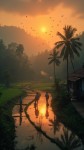 Sunrise Over Peaceful Village with Workers in Paddy Fields and Bird Flocks