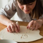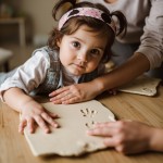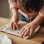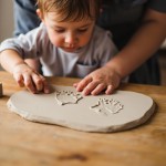 Mother Pressing Baby Handprints into Clay on Wooden Table