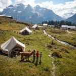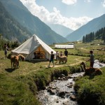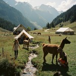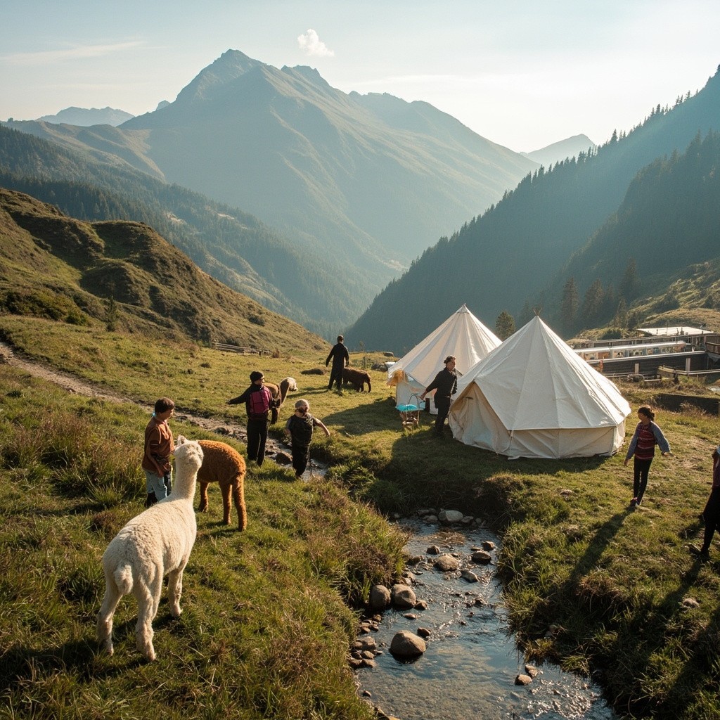 Glamping in Mountains with Alpacas, People, Children, Paths, Small River, Distant Strawberry Greenhouse, Horse Farm