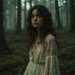 Moody Bohemian Woman in Lace Dress in Misty Forest