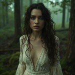 Bohemian fashion editorial of a woman with very long, dark brown loose curls, piercing blue eyes, and full lips. She wears a cream lace maxi dress with long bell sleeves, a plunging neckline, and delicate embroidery. Her hair is damp from the rain, clinging in soft waves. She stands in a misty forest beneath tall trees, surrounded by mossy ground and glistening leaves. Soft rain falls gently around her. Moody, romantic Vogue-style photography — cinematic, earthy, hauntingly beautiful.