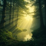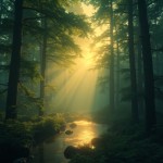 Mystical Forest at Golden Hour with Light Rays and Glowing Pond