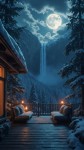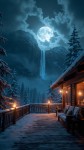 Winter Night Cabin Terrace Overlooking Waterfall