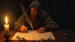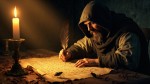 Old Slavic Scribe Writing on Parchment by Candlelight with Ants and Beetle