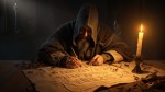 Create a detailed illustration in a 16:9 aspect ratio depicting an Old Slavic scribe writing on parchment with a quill feather. The scene should be illuminated by candlelight casting soft, warm shadows. The scribe is wearing a hooded robe, with his face fully obscured, conveying a contemplative and deep-in-thought expression. The parchment should be filled with indecipherable ancient-looking hieroglyphs, adding to the mystical atmosphere. Position the candle on a separate stand or holder to the side of the parchment, not directly on it, to ensure proper lighting of the writing area. Enhance the scene with a very large colony of ants crawling around the base of the candle and across the table surface, creating a sense of life and movement. A beetle should be perched on the edge of the parchment, adding an element of nature to the scholarly setting. The overall mood should be contemplative and ancient, with a touch of mysticism. Use warm, earthy tones for the lighting and environment, with the candlelight creating soft, golden highlights. Pay attention to the details of the medieval scribe’s attire and the texture of the parchment.
