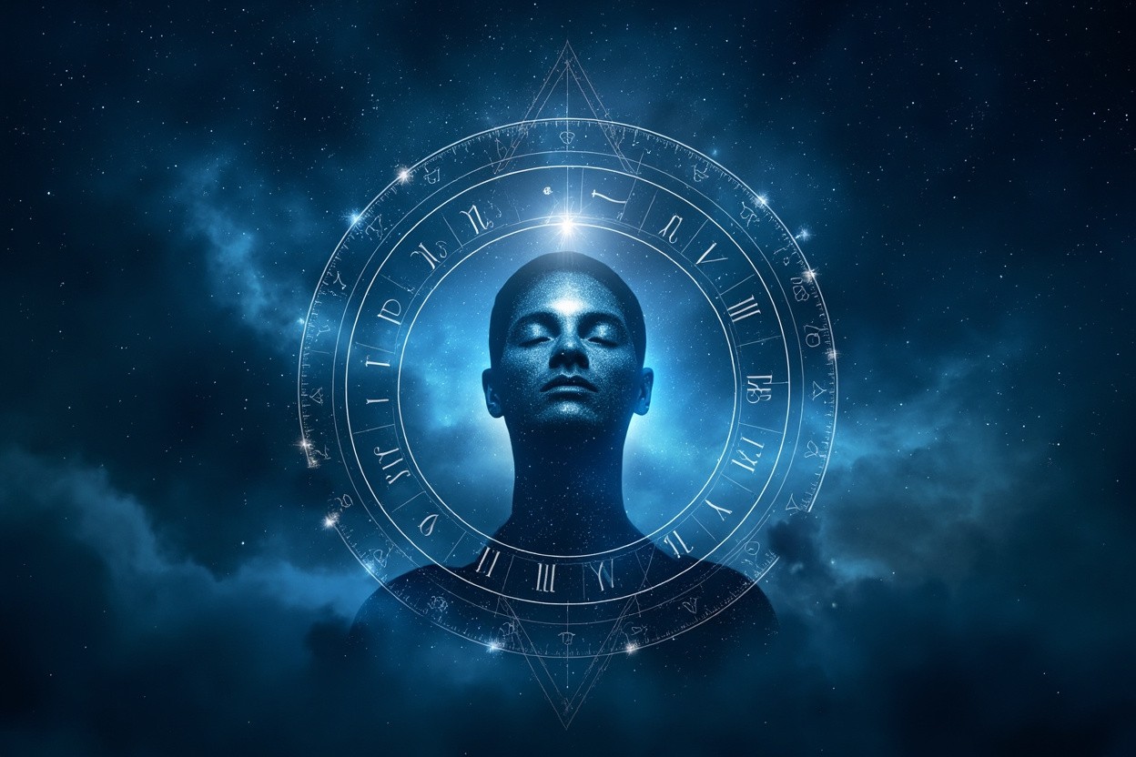 Spectacular horizontal Pinterest banner in a deep astrological and cosmic style. Vast universe background with rich midnight blue and indigo tones, soft nebula clouds, distant stars and subtle cosmic glow. In the center, a luminous zodiac wheel made of fine glowing lines, elegant and mystical, floating in space. Overlaying the zodiac circle, an archetypal human silhouette formed from starlight, calm and symmetrical, eyes closed, representing cosmic awareness. A radiant point of light at the forehead symbolizing the third eye and intuitive knowledge. Surrounding elements include delicate planetary symbols, constellation lines and thin astrological aspects connecting points in space. Subtle sacred geometry patterns integrated into the background, enhancing the sense of universal order. Mood: mystical, wise, timeless, contemplative. Style: high-end astrology art, cinematic, ethereal, refined, not crowded. Lighting: soft celestial glow, gentle highlights, deep contrast without harsh shadows. No text, no typography. Ultra high resolution, wide horizontal composition perfect for Pinterest banner.