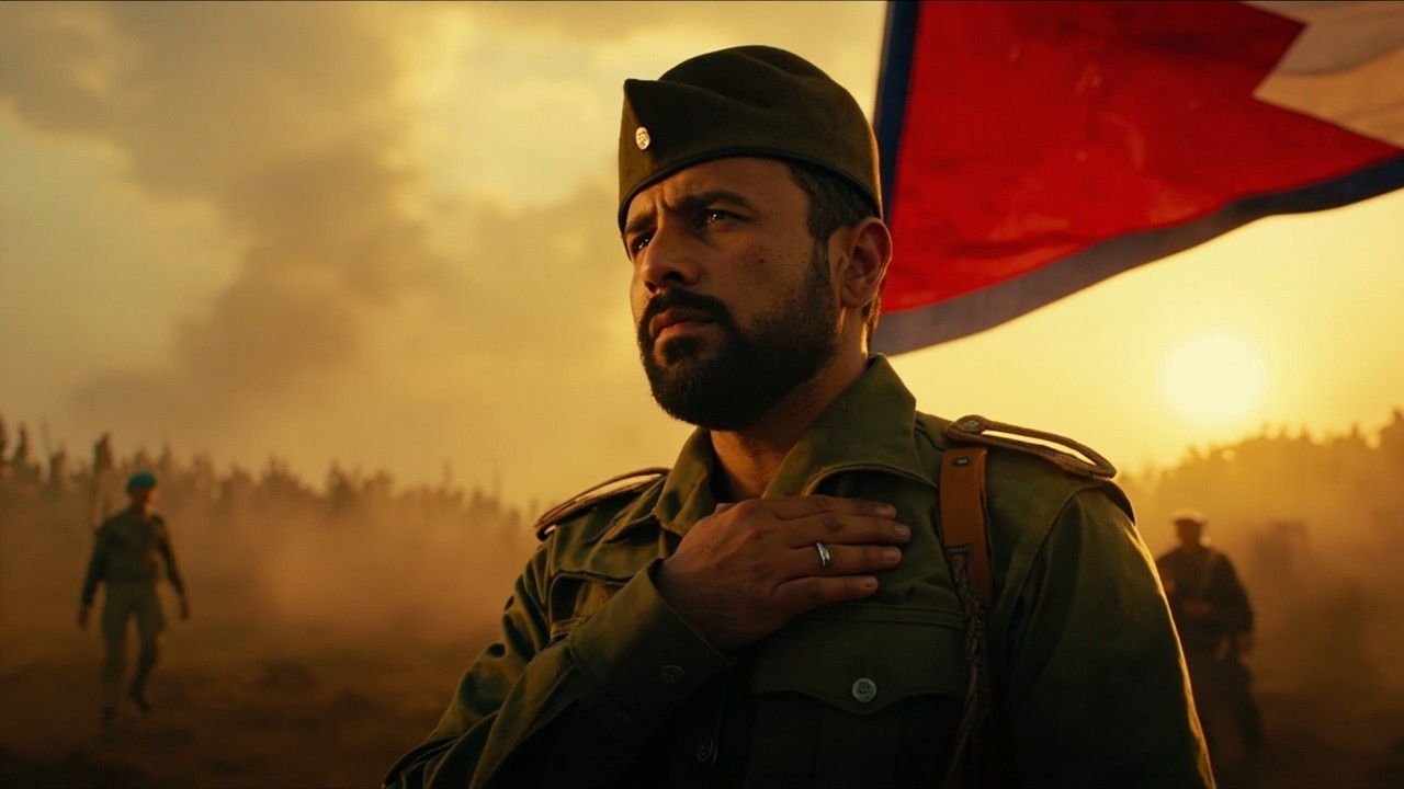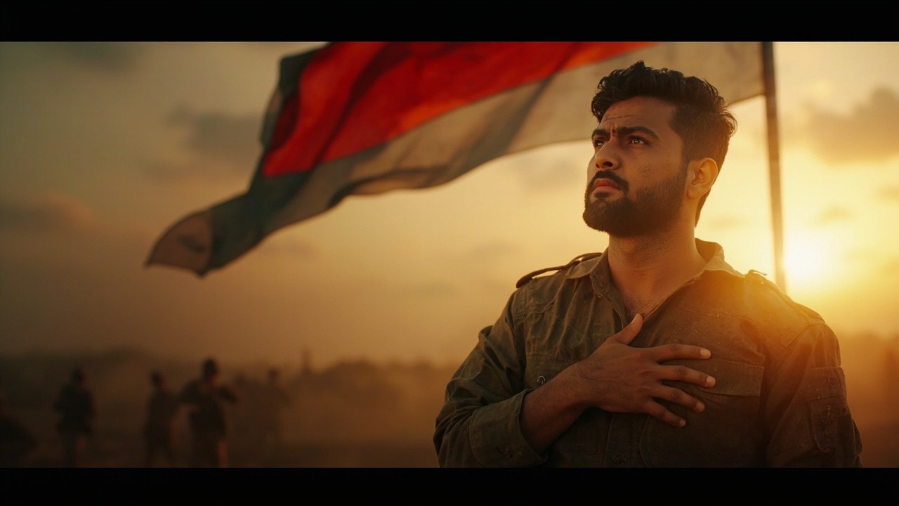 “A cinematic, high-impact YouTube thumbnail for a music video about a soldier who loves his country more than himself. A brave nepali soldier stands in the foreground, wearing a military uniform, slightly worn and dusty, symbolizing sacrifice. He looks forward with determination and quiet emotion, eyes reflecting pride and pain. One hand is placed over his heart while the national flag waves behind him dramatically in the wind. The background shows a battlefield fading into a sunrise, symbolizing hope and sacrifice. Strong contrast lighting, dramatic shadows, epic cinematic tone, emotional and patriotic mood, ultra-sharp focus on the soldier, background slightly blurred. Designed for YouTube thumbnail, bold composition, powerful storytelling, 16:9 aspect ratio, high saturation, professional cinematic photography.