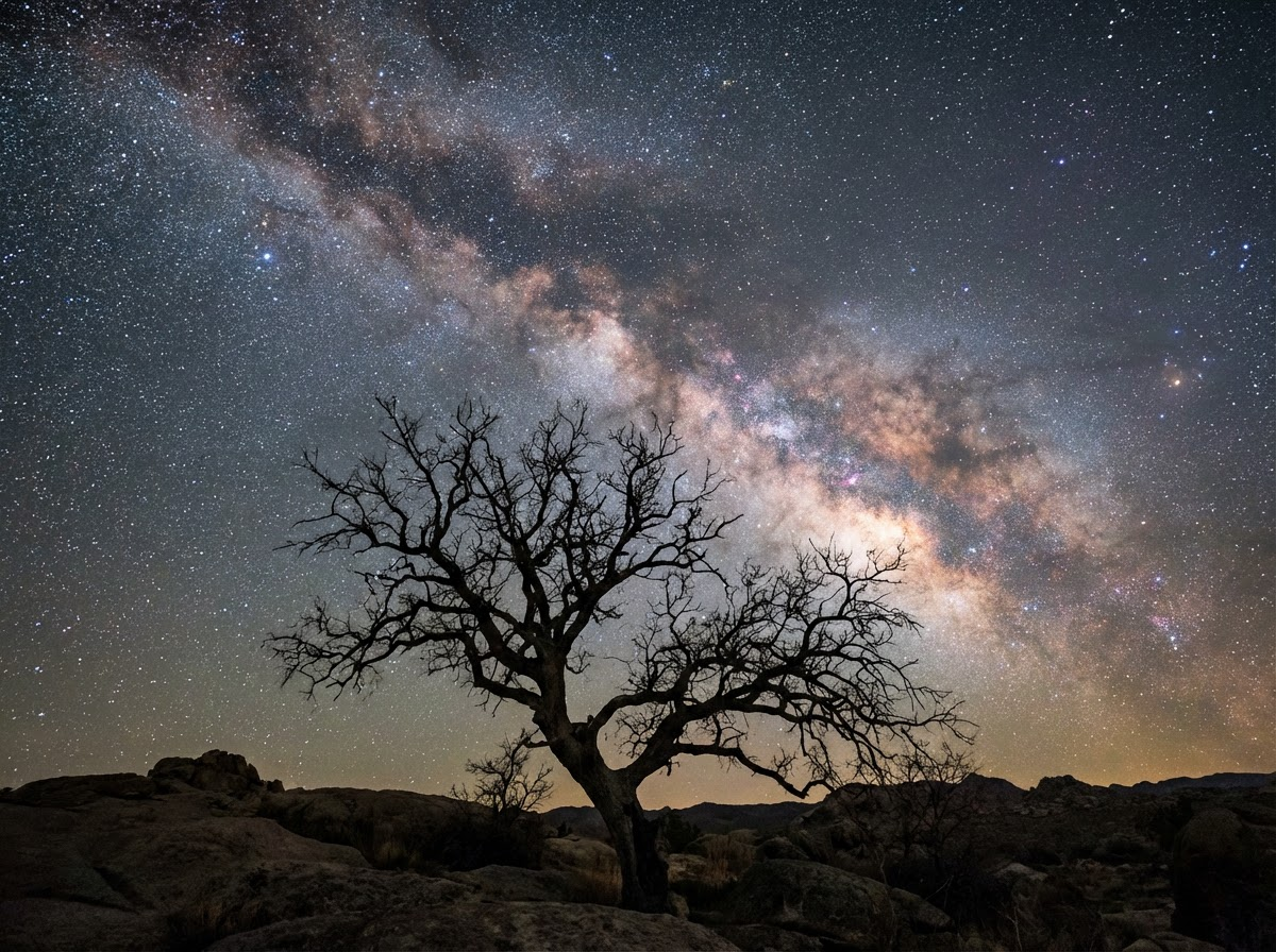 Beautiful hyperrealistic astrophotography shot of night sky with tree silhouette.