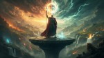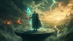 Odin on Stone Platform Between Radiant and Stormy Lands Holding Glowing Staff