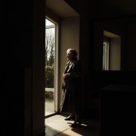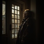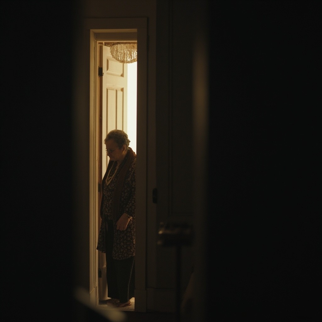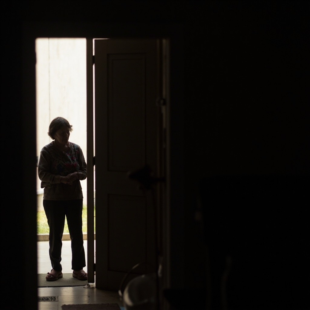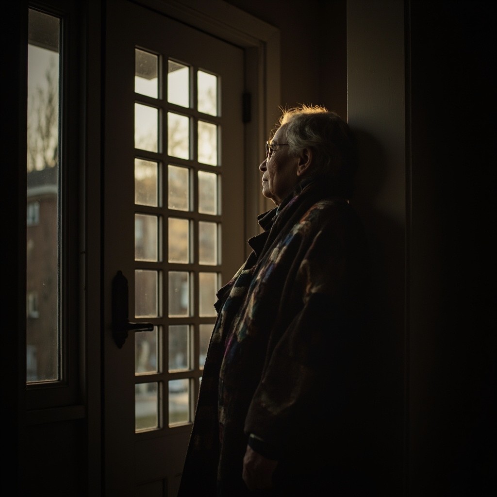 Elderly Woman Waiting Inside Front Door in Soft Light
