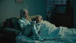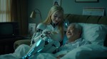 Korean Female Robot with Blond Hair and Elderly Chinese Man in Bedroom