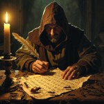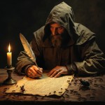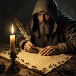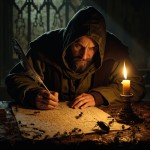 Old Slavic Scribe Writing on Parchment Illuminated by Candlelight with Ants and Beetle