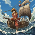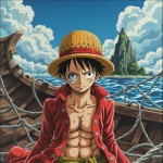 One Piece Character with Serious Features and Wolf Eye Scar on a Semi-Smashed Ship, Ocean and Islands Background