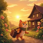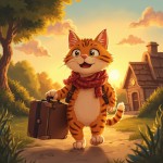 Cartoon Tiger-Striped Cat Returning Home with Worn Suitcase at Sunset