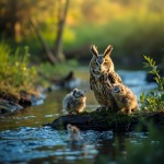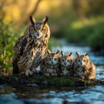 Long-Eared Owl and Owlets on Mossy Log Beside Blue Stream