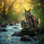 A long-eared owl with three fluffy owlets perched on a mossy log beside a clear, blue-tinted stream, surrounded by lush green vegetation in the background, soft diffused sunlight filling the scene, warm and natural golden-hour tones, highly realistic wildlife scene, ultra-detailed feathers and textures, shallow depth of field, natural composition, National Geographic style