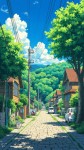 A beautifully illustrated suburban street in Japan, in the style of a vibrant hand-drawn anime. The scene shows a quiet residential neighborhood with charming wooden houses, leafy green trees lining both sides, and power lines crisscrossing overhead. The cobblestone path is slightly overgrown with small plants, adding a touch of rustic charm. Bright summer sunlight filters through the trees, casting soft shadows. The sky above is a deep, vivid blue scattered with fluffy white clouds. Parked compact cars and bicycles enhance the peaceful, everyday life feel. Highly detailed, warm, nostalgic, Studio Ghibli-inspired anime aesthetic.