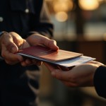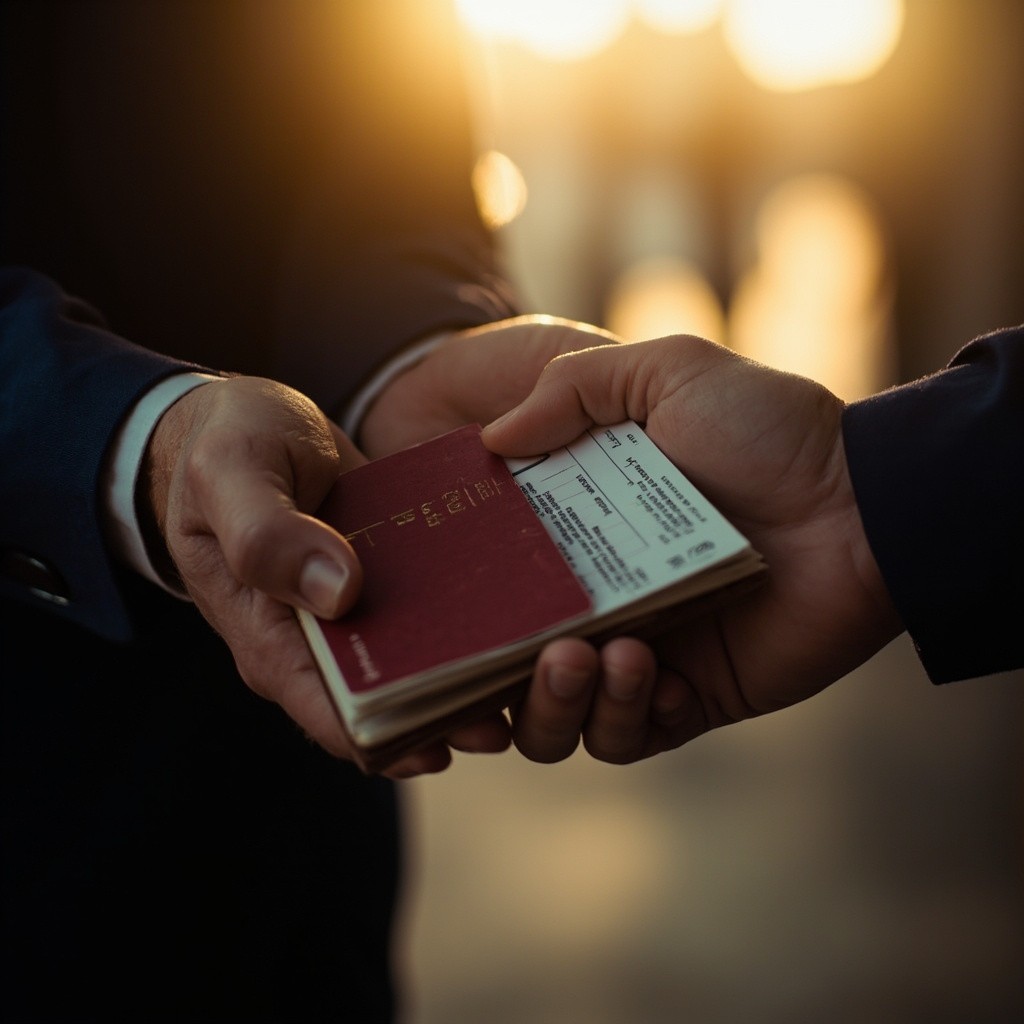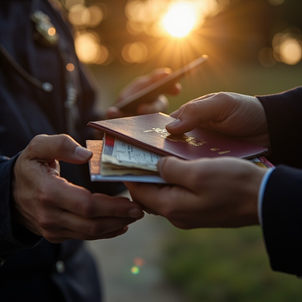 A highly detailed, hyper-realistic close-up shot from a over-the-shoulder perspective. Two hands gently handing over a set of official documents (a burgundy passport, a red work patent card, and some receipts) to another pair of hands. The receiving hands are wearing the dark blue fabric of a police uniform sleeve. The scene conveys trust and peaceful interaction. Soft, warm sunset light creates a golden rim light on the edges of the documents and hands. Cinematic composition, shallow depth of field, the background is completely blurred (bokeh) to focus on the texture of the skin, the fibers of the uniform, and the glossy surface of the documents. 8k, shot on 50mm lens, f/1.4, natural skin texture