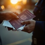 Over-the-Shoulder View of Hands Exchanging Passport and Work Documents