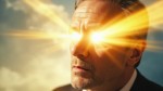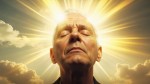 Middle-Aged Person Opening Eyes to Heavenly Light with Cloudy Sky Background and Inspirational Text Overlay