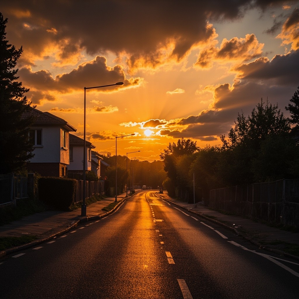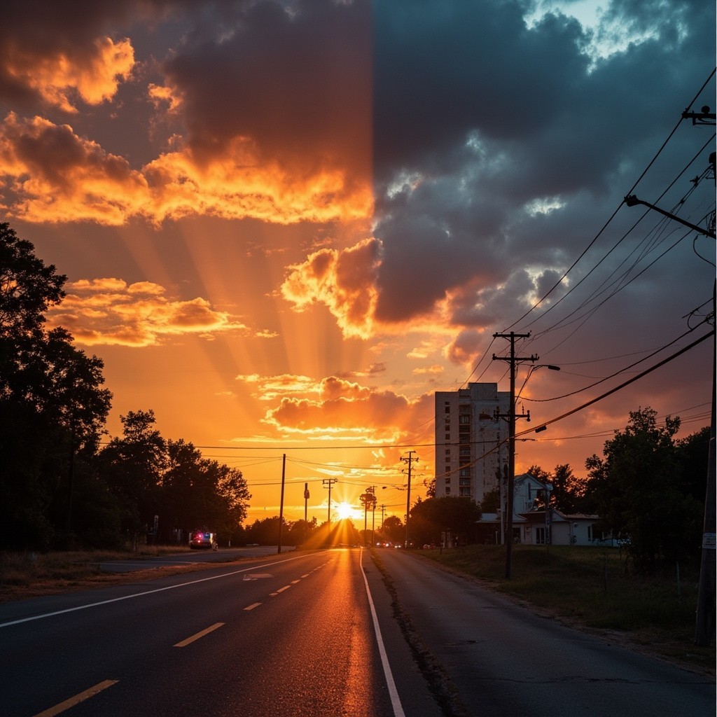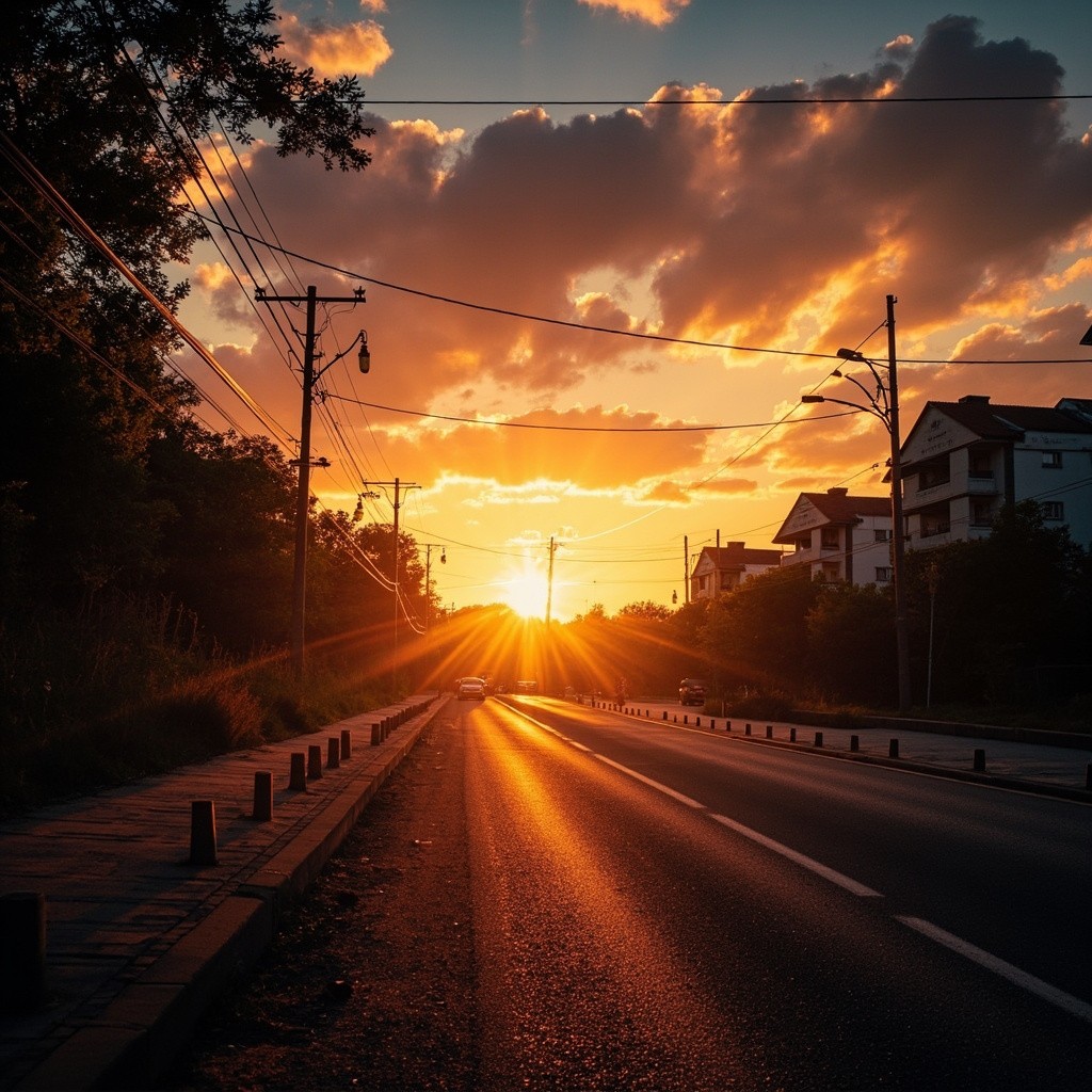 Transform this image into a dramatic sunset HDR style while preserving 100% of the original content. Do NOT change, add, remove, replace, or distort any object, subject, animal, person, building, tree, road, shadow, reflection, or background. Maintain the exact same: composition framing perspective w.compcation.foming camera angle subject positions shapes and proportions Colors must look realistic, not oversaturated, not artificial. No fantasy effects, no extra clouds, no extra sun, no lens flares no fog, no rain Lighting already present. V. strict color and lighting transformation only. Photorealistic sunset HDR edit. Original image must remain perfectly recognizable