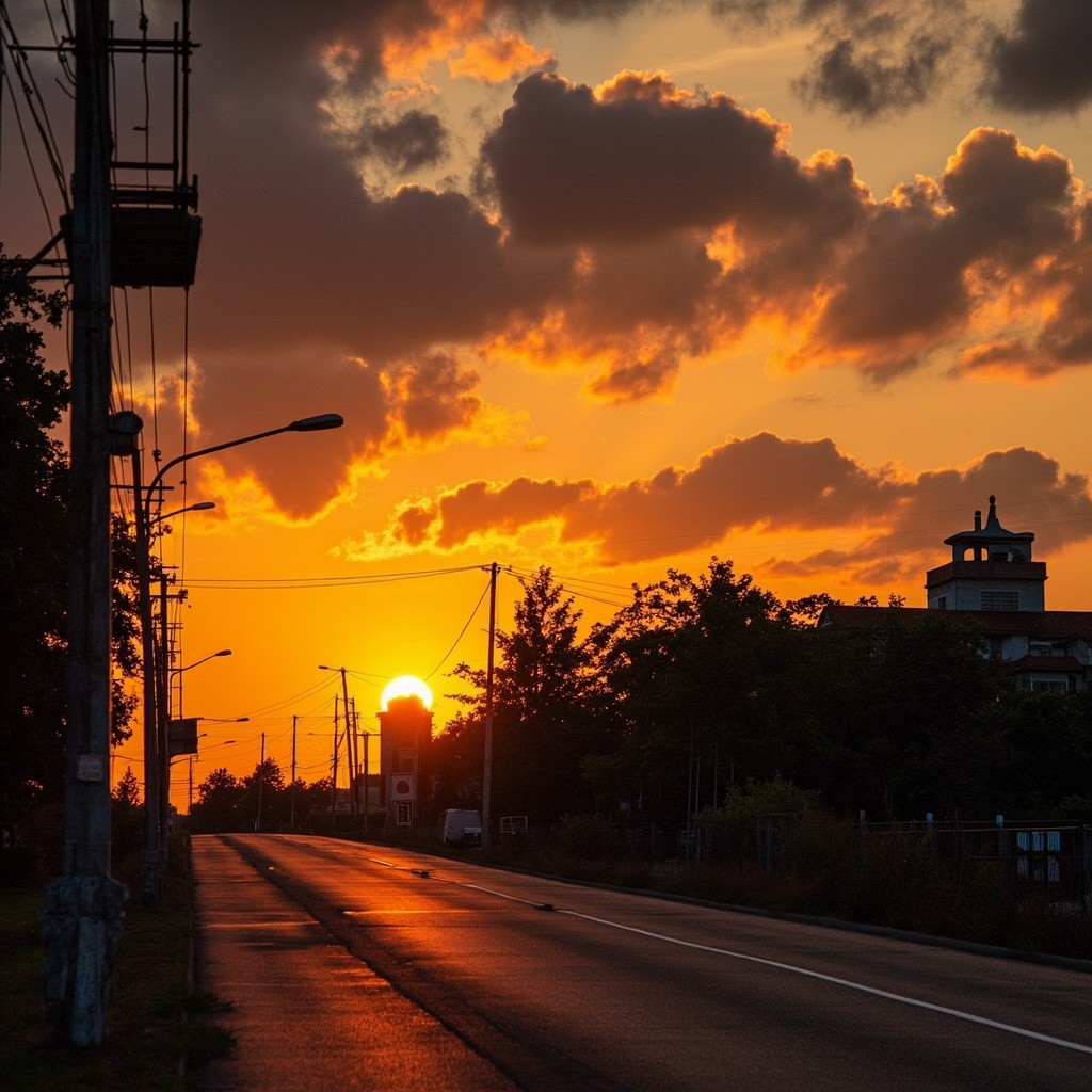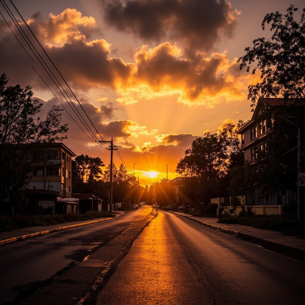 Transform this image into a dramatic sunset HDR style while preserving 100% of the original content. Do NOT change, add, remove, replace, or distort any object, subject, animal, person, building, tree, road, shadow, reflection, or background. Maintain the exact same: composition framing perspective w.compcation.foming camera angle subject positions shapes and proportions Colors must look realistic, not oversaturated, not artificial. No fantasy effects, no extra clouds, no extra sun, no lens flares, no fog, no rain unless already present. This is a strict color and lighting transformation only. Photorealistic sunset HDR edit. Original image must remain perfectly recognizable