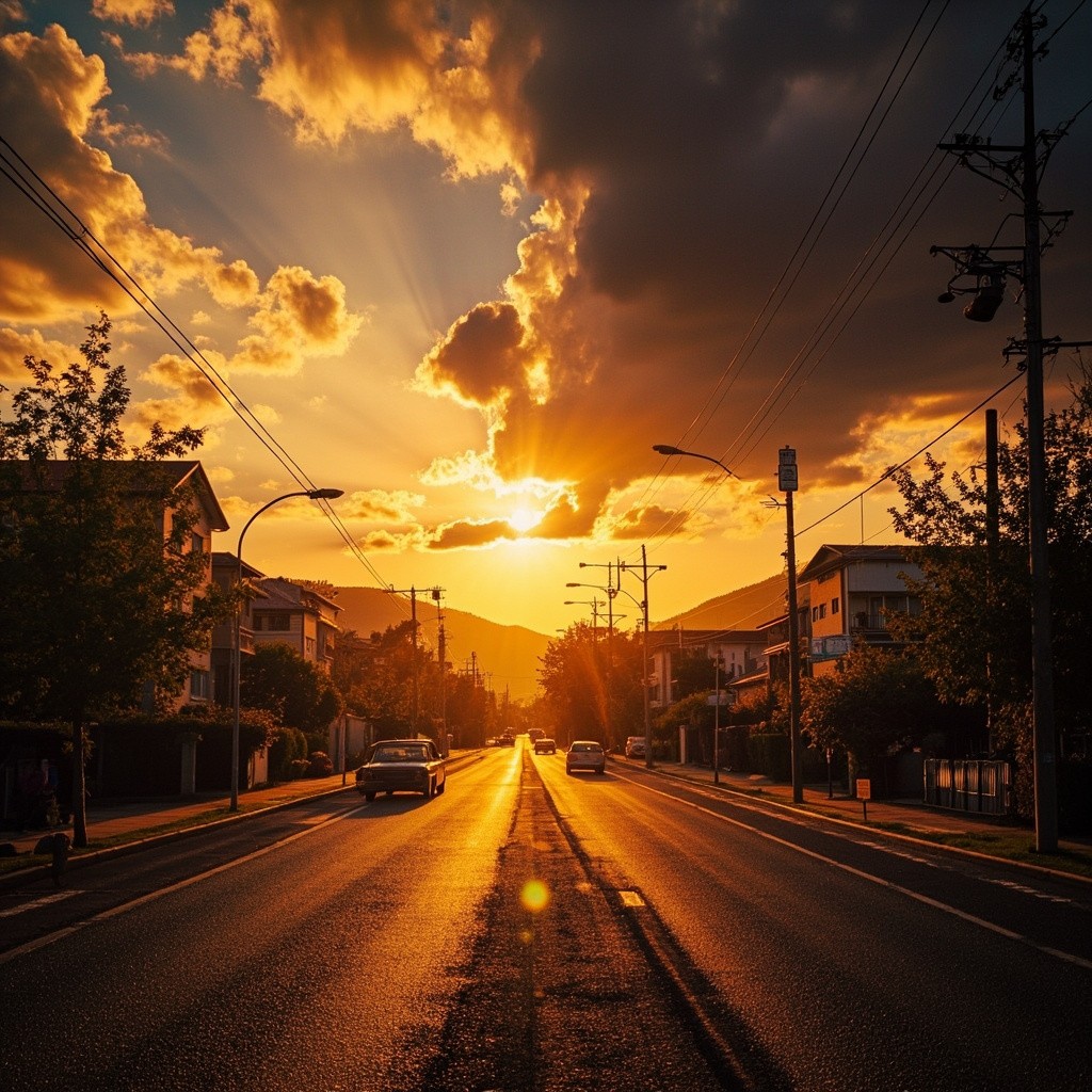 Transform this image into a dramatic sunset HDR style while preserving 100% of the original content. Do NOT change, add, remove, replace, or distort any object, subject, animal, person, building, tree, road, shadow, reflection, or background. Maintain the exact same: composition framing perspective w.compcation.foming camera angle subject positions shapes and proportions Colors must look realistic, not oversaturated, not artificial. No fantasy effects, no extra clouds, no extra sun, no lens flares, no fog, no rain unless already present. This is a strict color and lighting transformation only. Photorealistic sunset HDR edit. Original image must remain perfectly recognizable