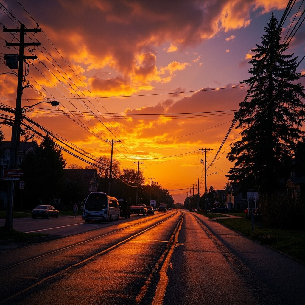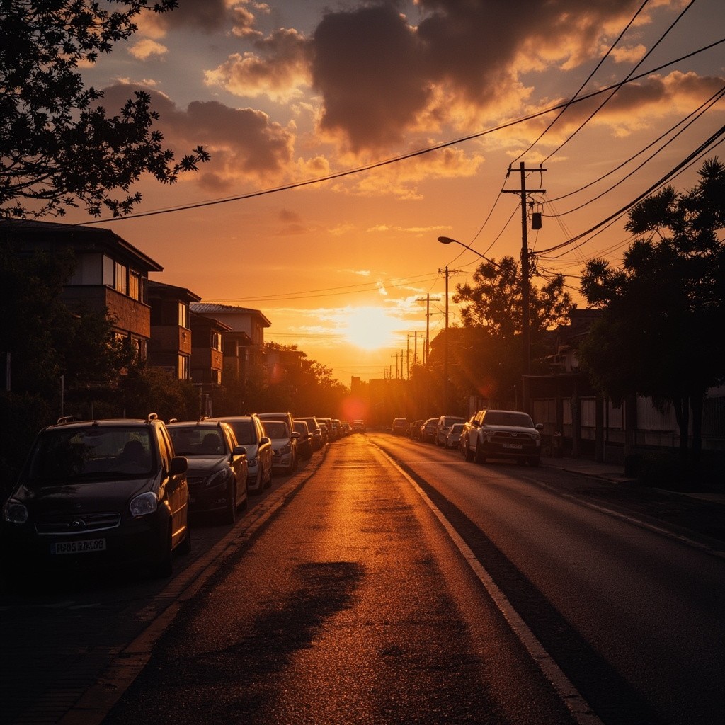 Transform this image into a dramatic sunset HDR style while preserving 100% of the original content. Do NOT change, add, remove, replace, or distort any object, subject, animal, person, building, tree, road, shadow, reflection, or background. Maintain the exact same: composition framing perspective w.compcation.foming camera angle subject positions shapes and proportions Colors must look realistic, not oversaturated, not artificial. No fantasy effects, no extra clouds, no extra sun, no lens flares, no fog, no rain unless already present. This is a strict color and lighting transformation only. Photorealistic sunset HDR edit. Original image must remain perfectly recognizable