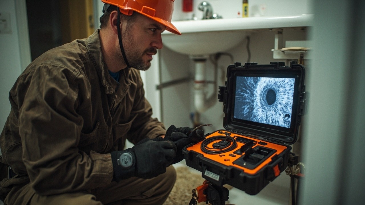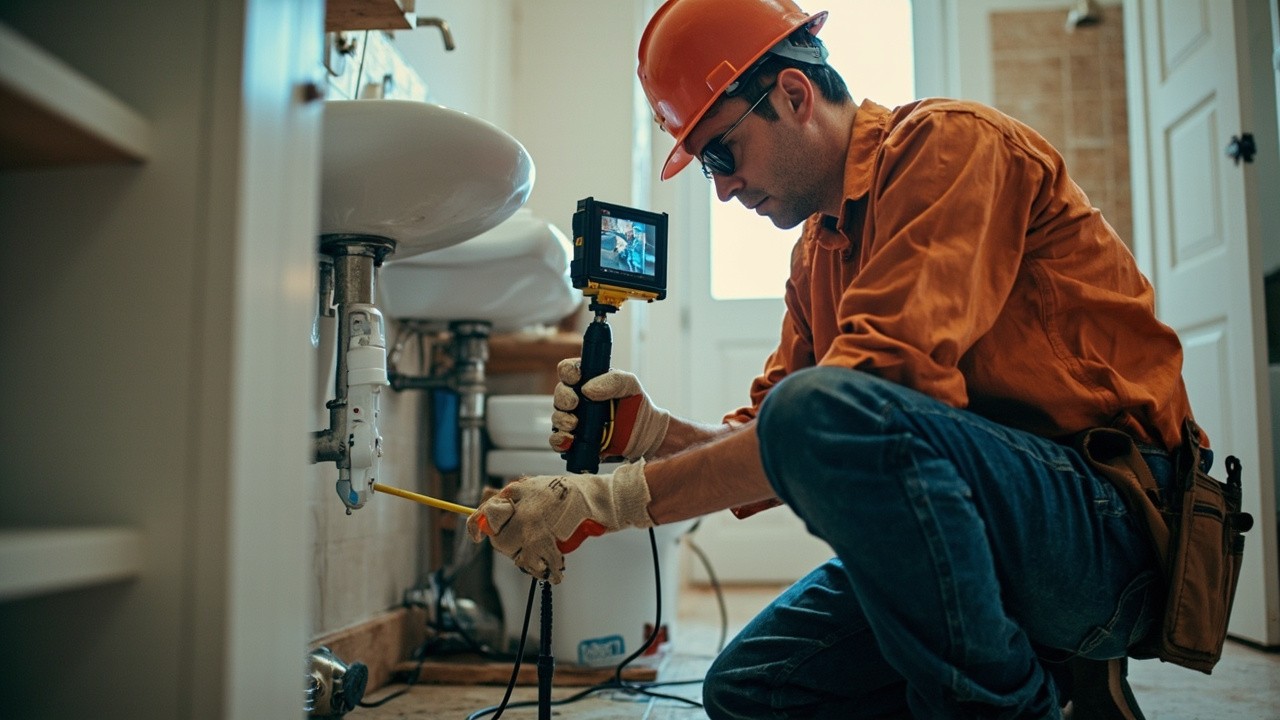 American Plumber Inspecting Sewer Pipe with Detector in Bright Bathroom