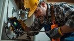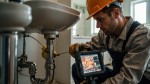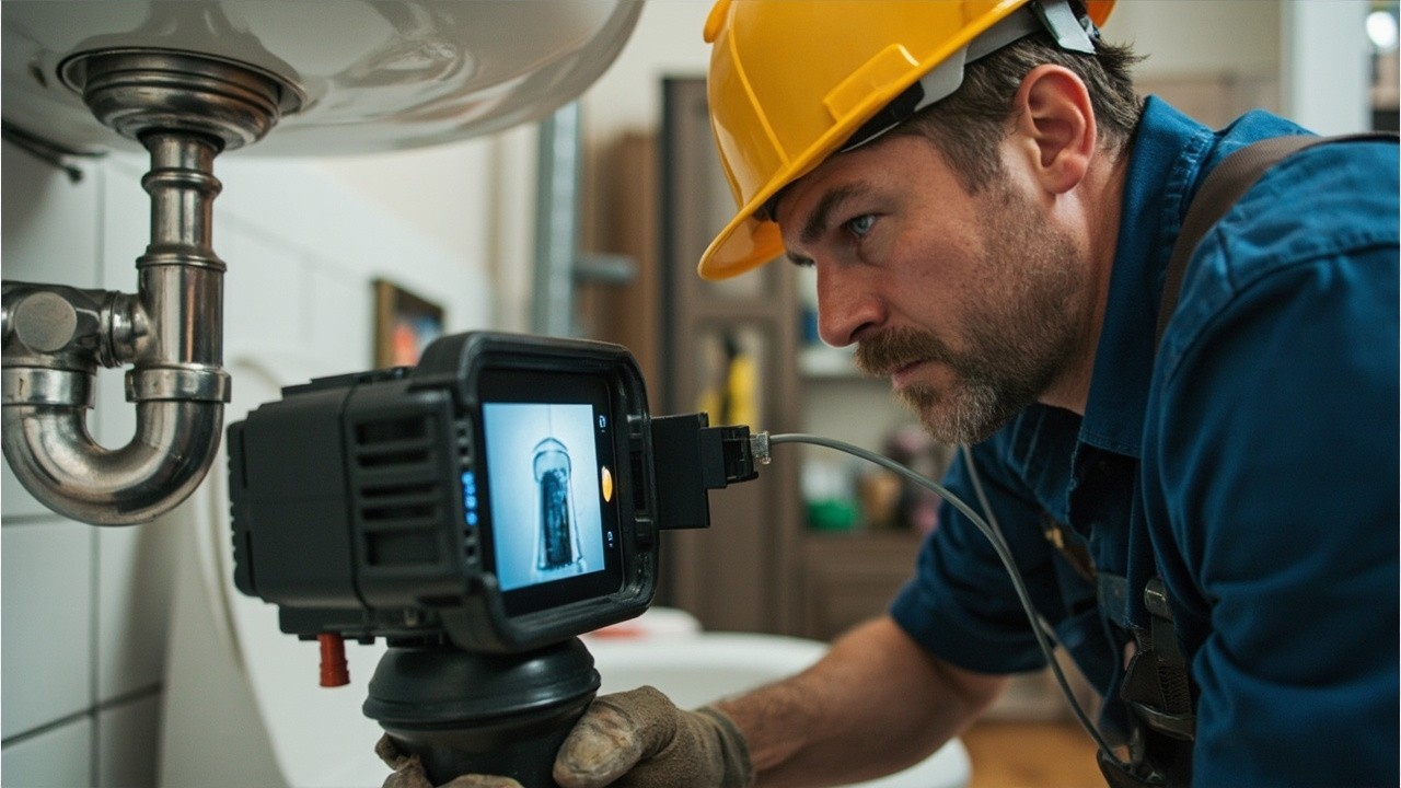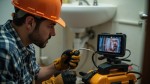 American Plumber Inspecting Sewer Pipe Using Detector in Bright Bathroom
