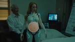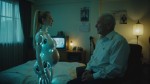 Pregnant Korean Female Robot Smiling at Elderly Chinese Man in Simple Bedroom at Night