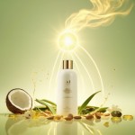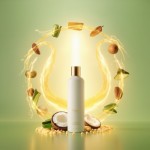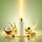 Premium Shampoo Bottle with Glowing Natural Ingredients on Light Green Background