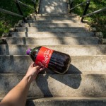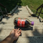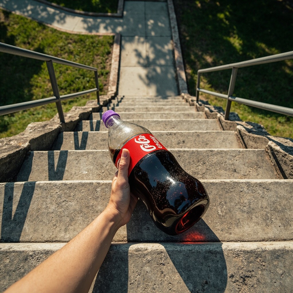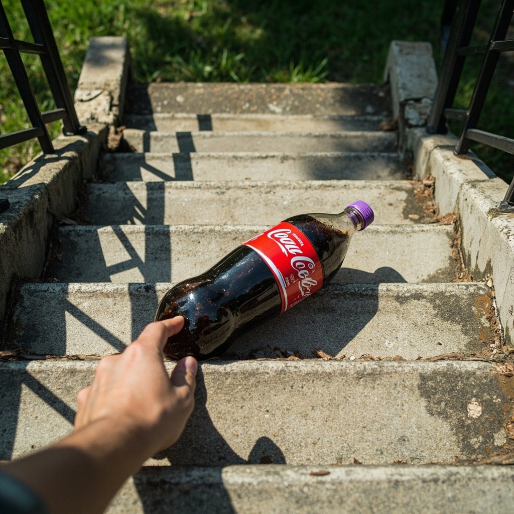 First-Person View of Hand Touching Cola Jar on Outdoor Concrete Staircase in Sunlight