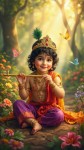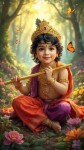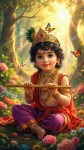 the sweet child Prince Shri Krishna with fair skin and shoulder length black hair, sitting amongst a variety of colorful flowers and plants in a clearing of a lush forest, holding a gold flute. Heis adorned in a gold crown and gold jewelry embedded with diamonds and jewels and he is wearing traditional colorful red and purple Indian silk kurtas. Colorful butterflies flit around the Prince as he smiles and looks at the camera. In the background rays of sunlight penetrate the forest trees to highlight the young prince in a glowing aura