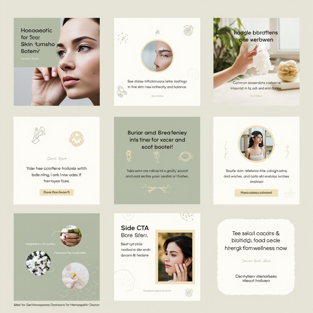 Create a clean, professional Instagram carousel for a homoeopathic doctor. Theme: Homoeopathy for Skin Problems (Acne, Eczema, Itching, Rashes) Style: • Minimal, medical + holistic • Calm, reassuring, trustworthy • Soft pastel colors (sage green, beige, off-white) • Plenty of white space • No aggressive marketing Fonts: • Headings: clean bold sans-serif • Body text: simple, readable Slides structure: 1. Hook slide with bold question 2. Problem explanation (temporary relief) 3. Insight: skin reflects internal health 4. Internal causes with icons 5. Homoeopathy approach (root cause, individualised, gentle) 6. Healing message 7. Soft CTA + doctor branding Design rules: • One key message per slide • Use subtle medical / nature icons • Avoid before–after images • Add doctor name/logo only on last slide • Instagram-friendly square format (1080×1080Make first slide of skin problems like itching,rash, eczema Say frustrated by repeating n skin issues Second Temporary relief isn't the answer Third is Your skin reflect internal imbalance Fourth is common internal cause is digestion, stress, hormone, immunity Fifth is heal inside skin improve outside Sixth is homoeopathy A gentle approach Treat the root cause Tailor to your unique body Promote lasting wellness from within . Seventh is ready for lasting skin wellness Book your appointment now With this content make impactful, professional and patient relatable realistic images)