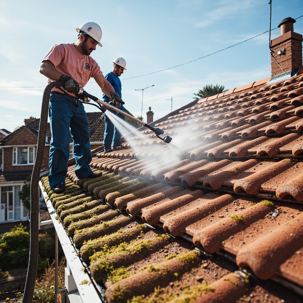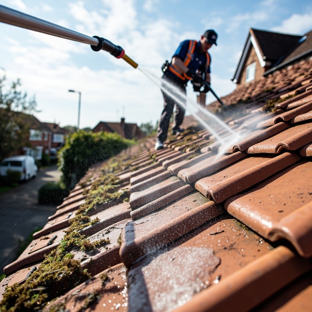 Professional Roof Tile Cleaning in Action on a Suburban UK Home
