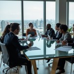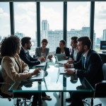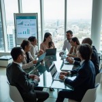 Diverse Professionals Collaborating in High-Rise Office with Digital Charts