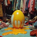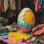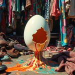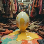 Retro Acid Psychedelic Illustration of Melting Egg with Clothes in Second Hand Market