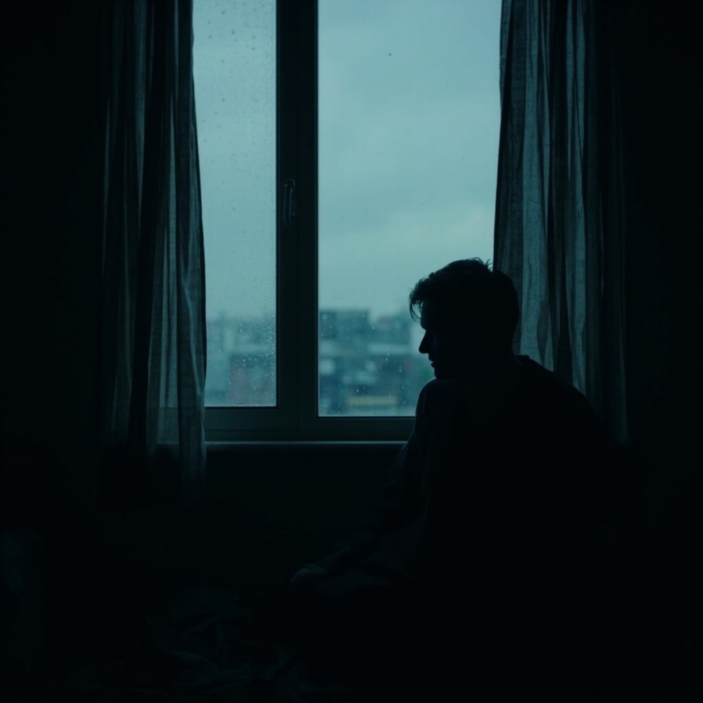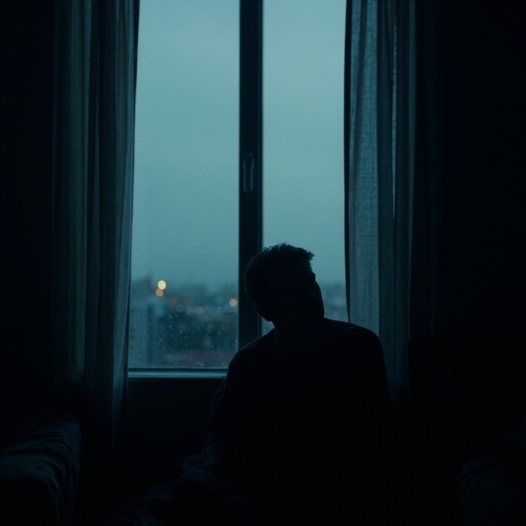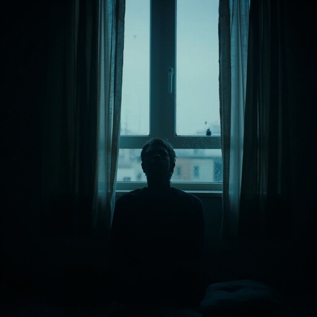 Ultra-realistic 8K cinematic ASMR video. A quiet, dimly lit room during early dawn. Soft blue-grey light enters through a half-open curtain. A single human silhouette sits still near a window, face not visible. The camera stays close — only slow breathing movement of shoulders. Outside the window, light rain falls gently, droplets sliding down the glass in macro focus. Subtle ASMR sounds: – faint rain tapping – fabric rustle as the person slightly shifts – distant city silence Camera movement: – very slow push-in (micro zoom) – shallow depth of field – no dramatic motion Mood: emotional exhaustion, acceptance, quiet strength. No dialogue, no music dominance — silence is the hero. Professional cinematic lighting, soft shadows, realistic skin texture, natural color grading.