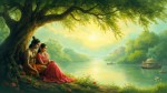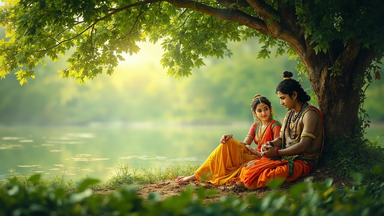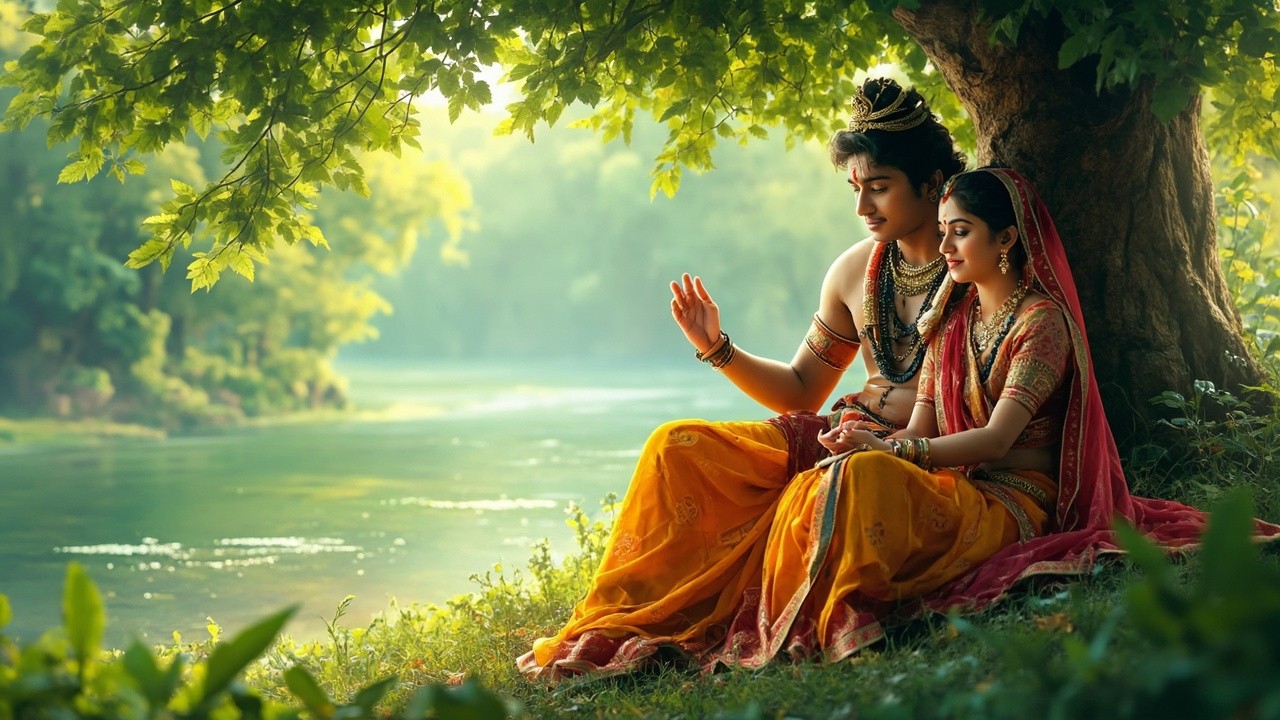 एक सुंदर वृंदावन का दृश्य हो, जहाँ पेड़-पौधे, यमुना का किनारा और हल्की हवा चल रही हो। राधा और कृष्ण एक पेड़ के नीचे बैठे प्रेम और भक्ति की मीठी बातें कर रहे हों। कृष्ण मुस्कुराकर राधा से प्रेम का अर्थ समझा रहे हों और राधा ध्यान से उनकी बात सुन रही हों। वातावरण शांत, आध्यात्मिक और प्रेम से भरा हो। कहानी में उनकी बातचीत से सच्चे प्रेम, विश्वास और भक्ति का संदेश मिले।"