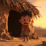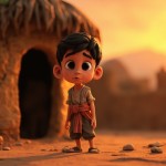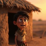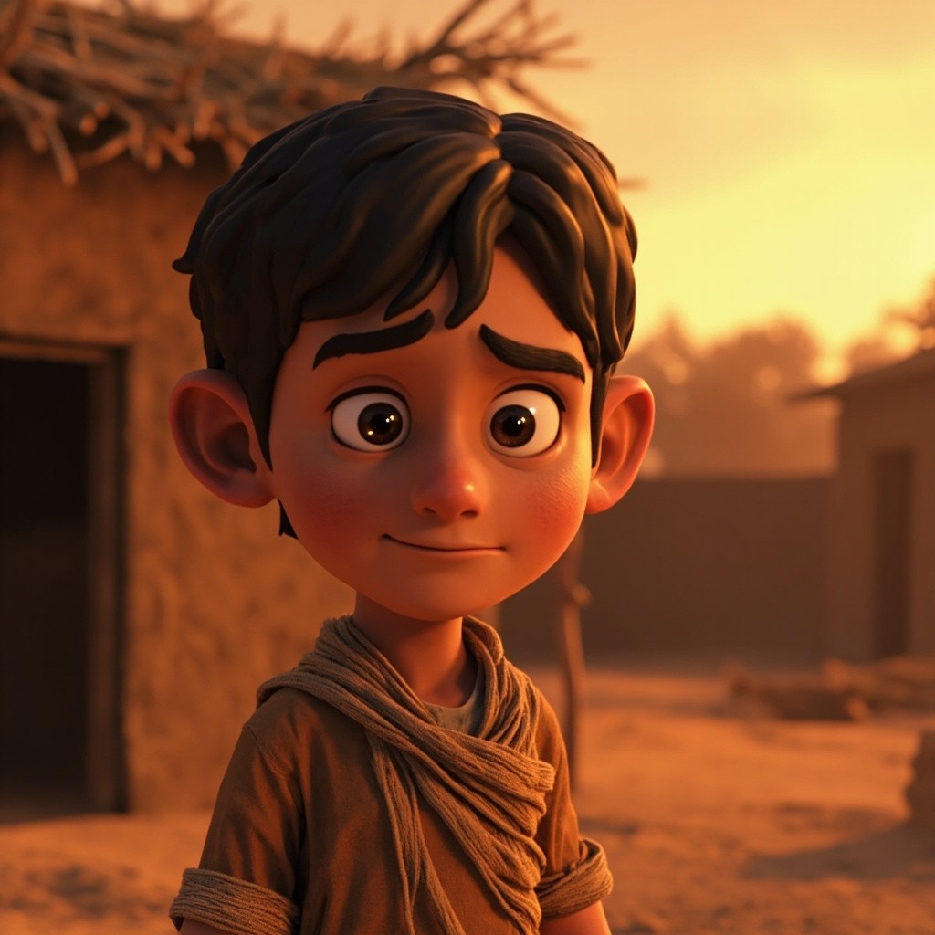 3D Cartoon of Boy Standing Outside Mud House in Indian Village at Sunset